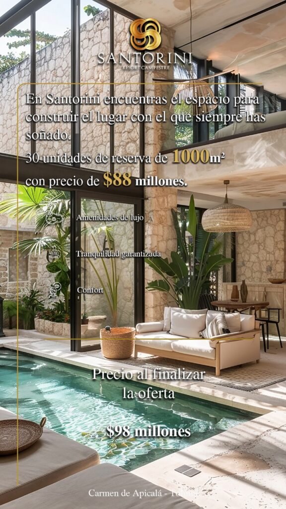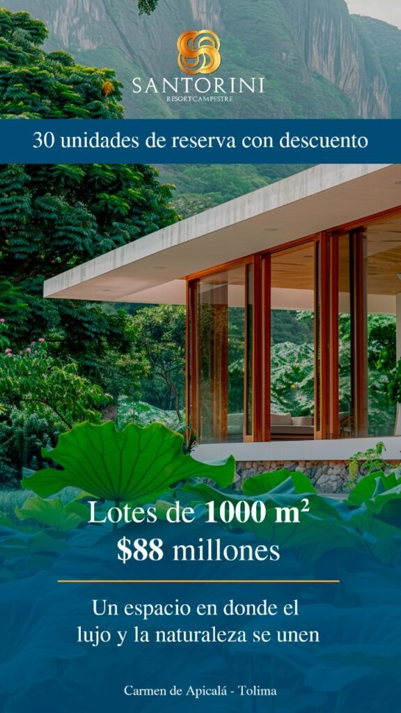 Santorini Resort Lotes Rurales en Carmen de Apicalá es un proyecto pensado para quienes buscan tranquilidad, naturaleza y confort.